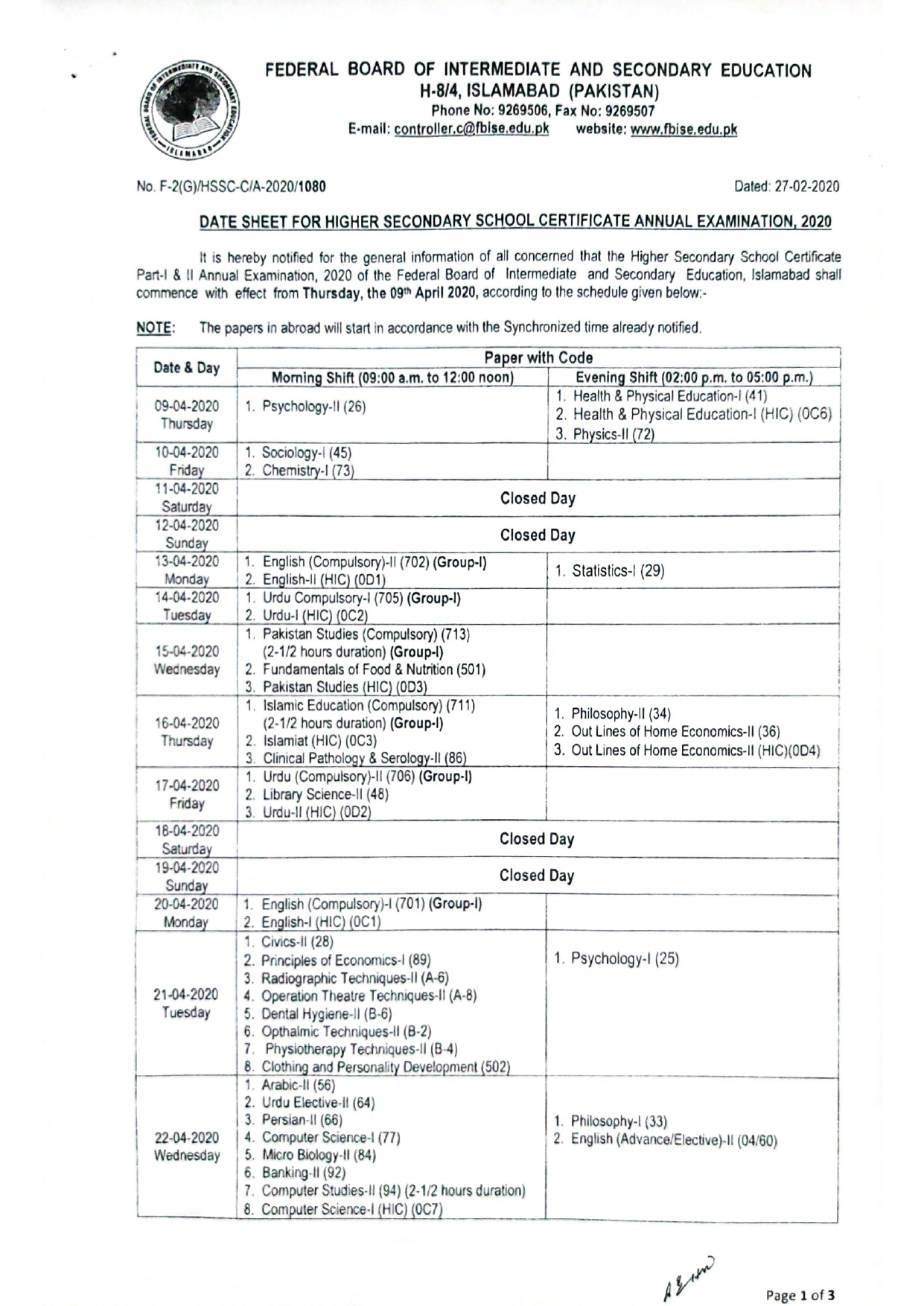 Fbise Official On Twitter Date Sheet For Hssc Annual Exams 2020 Datesheet Hssc 2020 Exams Islamabad Pakistan Federal Board
